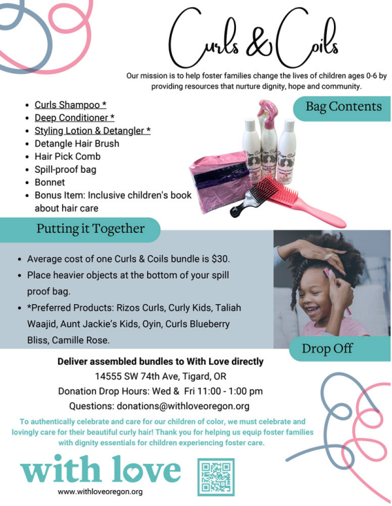 Our Curls & Coils program exists to provide resource and adoptive families with a more comprehensive understanding of products and techniques necessary to achieve healthy, beautiful hair for their curly- and coily-haired kiddos.